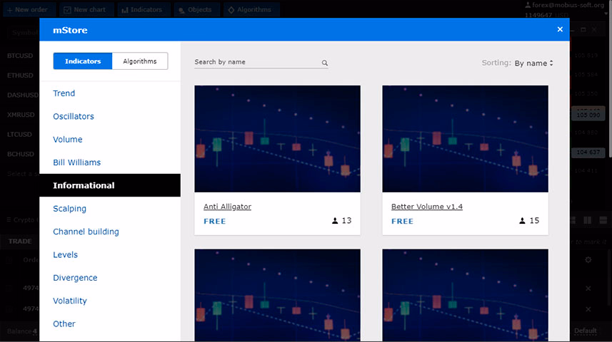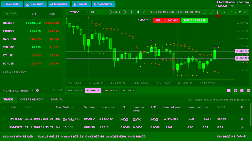 This trading software opens up limitless opportunities for trading. Mobius Trader allows you not only to make transactions in the market, but also to place various orders and use a server-based trailing stop.