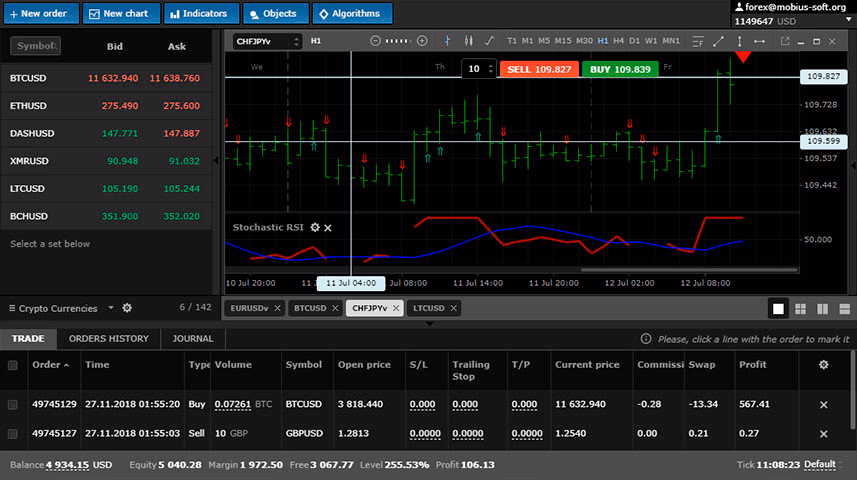 This trading software opens up limitless opportunities for trading. Mobius Trader allows you not only to make transactions in the market, but also to place various orders and use a server-based trailing stop.
